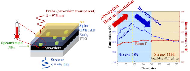 Figure caption : (À gauche) : schéma de l’architecture du dispositif et de la stratégie d’intégration de nanoparticules de conversion ascendante (UCNPs) comme nanothermomètres à l’interface enfouie pérovskite/HTL ; (À droite) : évolution de la température interfaciale au cours de la dégradation accélérée sous illumination. Les mesures révèlent des mécanismes concurrents, incluant l’accumulation thermique et la décomposition du matériau, dont la dominance relative dépend à la fois de l’intensité du « stressor » appliqué et de la composition de la pérovskite