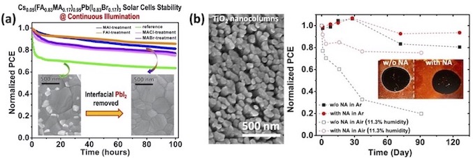 Figure caption : (a) Évolution du rendement sur 100 h de cellules solaires à pérovskite triple cation CsMAFAPb(I1-xBrx)3 non encapsulées, dont la couche active a été traitée par MAI (bleu), FAI (orange), MABr (violet) ou MACl (rose), en comparaison avec une cellule de référence sans traitement (vert). Les mesures sont réalisées sous illumination continue AM 1.5G (100 mW cm-2) en atmosphère inerte (boîte à gants Ar). L’encart montre des images SEM de la couche active avant et après traitement MAI, illustrant l’élimination du PbI2 interfacial en excès. (b) À gauche : image SEM de nanocolonnes de TiO2 alignées verticalement. À droite : comportement en dégradation de cellules solaires à pérovskite triple cation utilisant une couche de transport d’électrons plane ou nanostructurée (nanocolonnes de TiO2). L’encart présente une image optique de deux dispositifs fabriqués sur le même substrat après vieillissement à l’air, sans (gauche) et avec (droite) nanocolonnes de TiO2.
