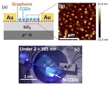 Figure caption : Exploitation des propriétés de piégeage de charges de nanoparticules de carbone fluorescentes dopées à l’azote, intégrées dans un transistor à effet de champ à base de graphène, pour la réalisation d’une mémoire optoélectronique à écriture optique et lecture électrique. (a) Architecture du dispositif FET ; (b) Caractérisation par microscopie à force atomique (AFM) de la couche active ; (c) Image optique du transistor à effet de champ fabriqué ; (d) Évolution du courant source-drain lors de cycles successifs d’écriture optique sous illumination UV et d’effacement sous polarisation électrique continue.