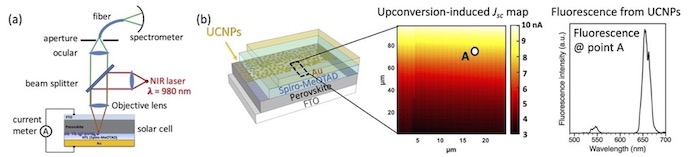 Figure caption : a) Schéma de l’architecture d’une cellule solaire à pérovskite dont une moitié de l’interface est décorée par des nanoparticules de conversion ascendante (UCNPs), ainsi que du dispositif expérimental de cartographie de photocourant par faisceau lumineux (micro-LBIC). (b) Cartographies de photocourant induit par conversion ascendante (𝜆ex = 980 nm) obtenues par micro-LBIC, mettant en évidence la contribution des UCNPs, corrélée à leur fluorescence caractéristique.