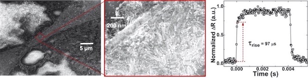 Figure caption : (Gauche) Image MEB d’un photodétecteur infrarouge court (SWIR) hybride associant des nanobâtonnets d’or et un microfil de platine ; (Centre) Vue agrandie du microfil de platine montrant la décoration dense en nanobâtonnets d’or à sa surface ; (Droite) Réponse photo-induite en fonction du temps du photodétecteur hybride AuNR/Pt sous illumination laser à λ = 1,5 µm.