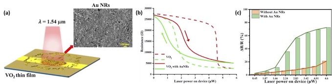 Figure caption : (a) Schéma du photodétecteur hybride plasmonique Au NR/VO2 (nanobâtonnets d’or colloïdaux couplés à un film de dioxyde de vanadium) ; (b) La décoration en Au NR modifie fortement le comportement de transition de phase photo-induite du VO2 sous-jacent (λlaser = 1,5 μm) ; (c) Réponse photoélectrique du dispositif hybride, exprimée en ΔR/R, comparée à celle du dispositif témoin sans Au NRs, pour différentes puissances laser.